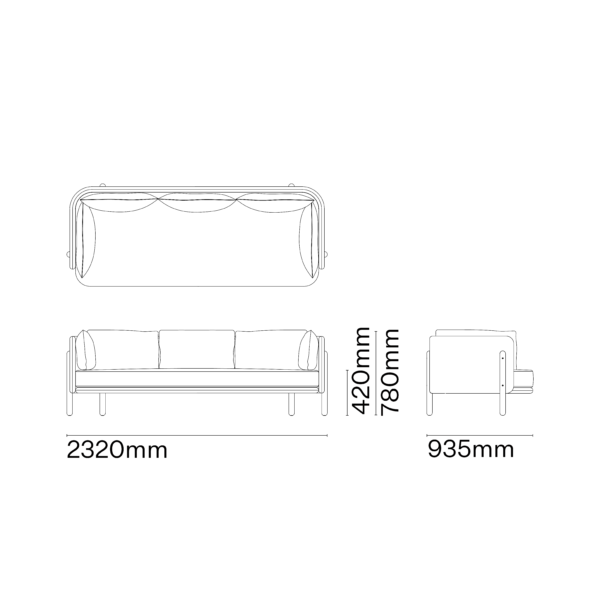 The sofa is generous in scale yet visually light with the outer frame being thin and the feet allowing breathing space under the sofa. The feather filled back cushions along with the generous seat cushion make the seating area inviting, supportive and cocooning.